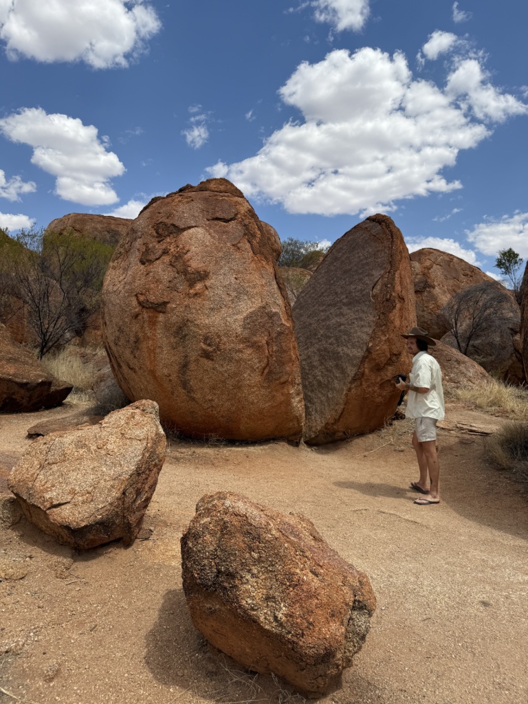 J’arrive le 19 Octobre sur Alice Springs après m’être arrêté aux ‘Devils Marbles‘ dans la réserve de Karlu-Karlu, ce sont des roches de granit en forme d’énormes billes formés par l’érosion depuis des milieu d’années et il y fait très, très, très chaud 🥵 Il y a plusieurs petits chemin balisés afin de faire le tour de ces gros cailloux. Conseil: Prends le nécessaire eau, chapeau et crème solaire avant de sortir de ton véhicule. Même si la marche n’est pas longue, j’y est attrapé mon plus beau coup de soleil. Et l’air me brûler les poumons.